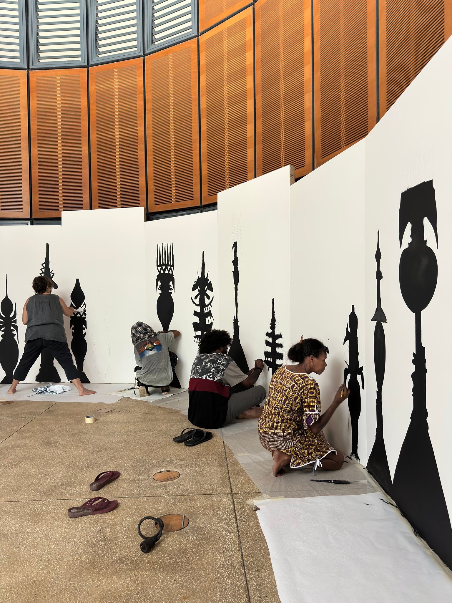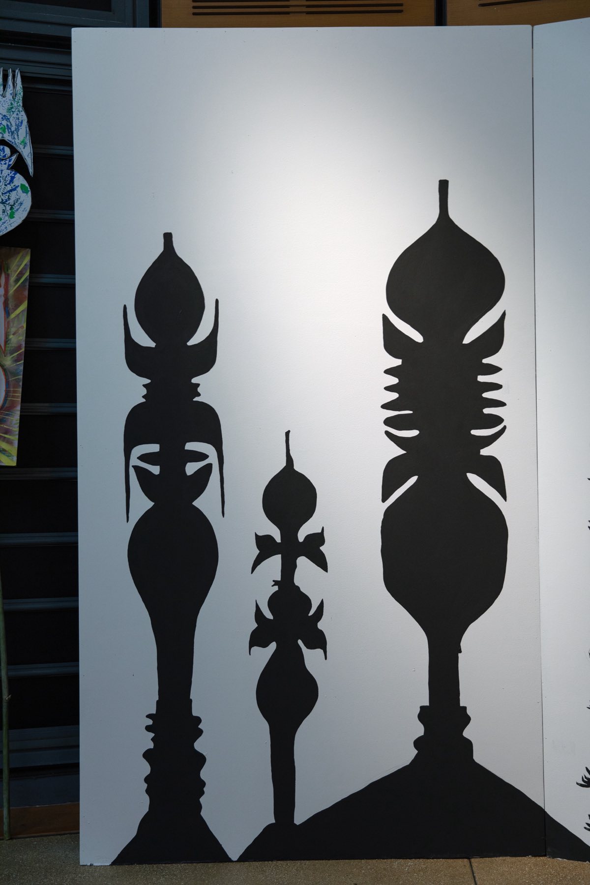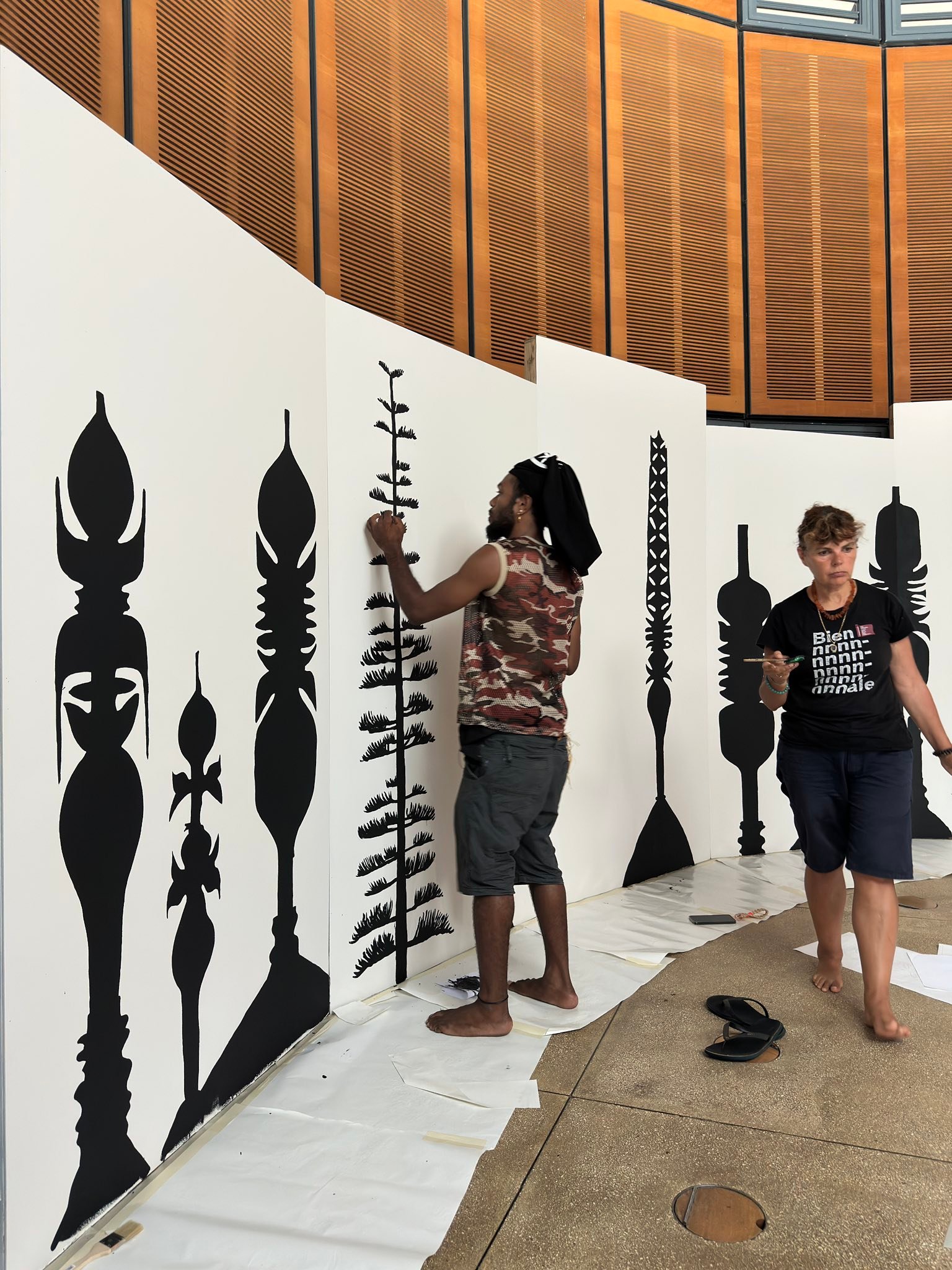 À partir de l’inventaire photographique du travail du sculpteur d’objets traditionnels kanak Raymond Bonnenfant, et notamment de ses formes de papier, gabarits de sculptures faîtières, les participants — artistes confirmés et amateurs — ont élaboré une fresques et plusieurs créations individuelles durant les workshops / Ateliers artistiques proposés par Mathieu Harel Vivier début janvier au Centre Culturel Tjibaou à Nouméa ainsi qu'en tribu à Grand Borendy à Thio en Kanaky / Nouvelle-Calédonie. Dans la case Bwenaado du Centre Culturel Tjibaou, une peinture murale en silhouettes noires figurent un point de vue sur les cimes de cases d’une tribu imaginée à l’échelle du territoire avec la diversité de ses flèches. Entre inventaire, invention et partage, l’exposition restitue le travail en atelier et donne à voir des formes en mouvement, traversées par des récits, des usages et des regards situés.
